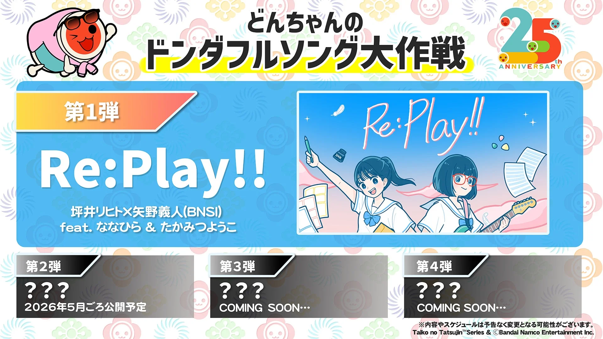 どんちゃんが音楽プロデューサーとして「太鼓の達人」の魅力を詰め込んだ新曲を制作する「どんちゃんのドンダフルソング大作戦」がスタート。第1弾楽曲『Re:Play!!』のミュージックビデオが公開されており、ななひらさんとたかみつようこさんの歌声が25周年の幕開けを華やかに彩ります。